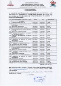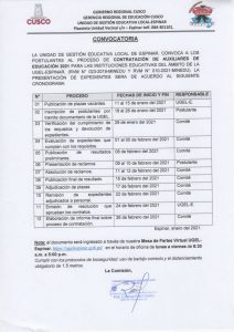 La Unidad de Gestión Educativa Local de la provincia de Espinar publicó el cronograma la contratacion de plazas docentes y de auxiliares para el presente año academcio 2021.